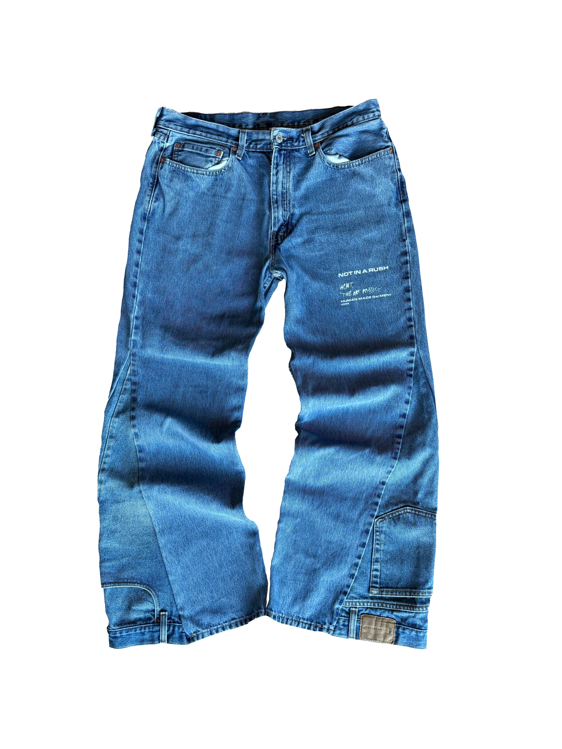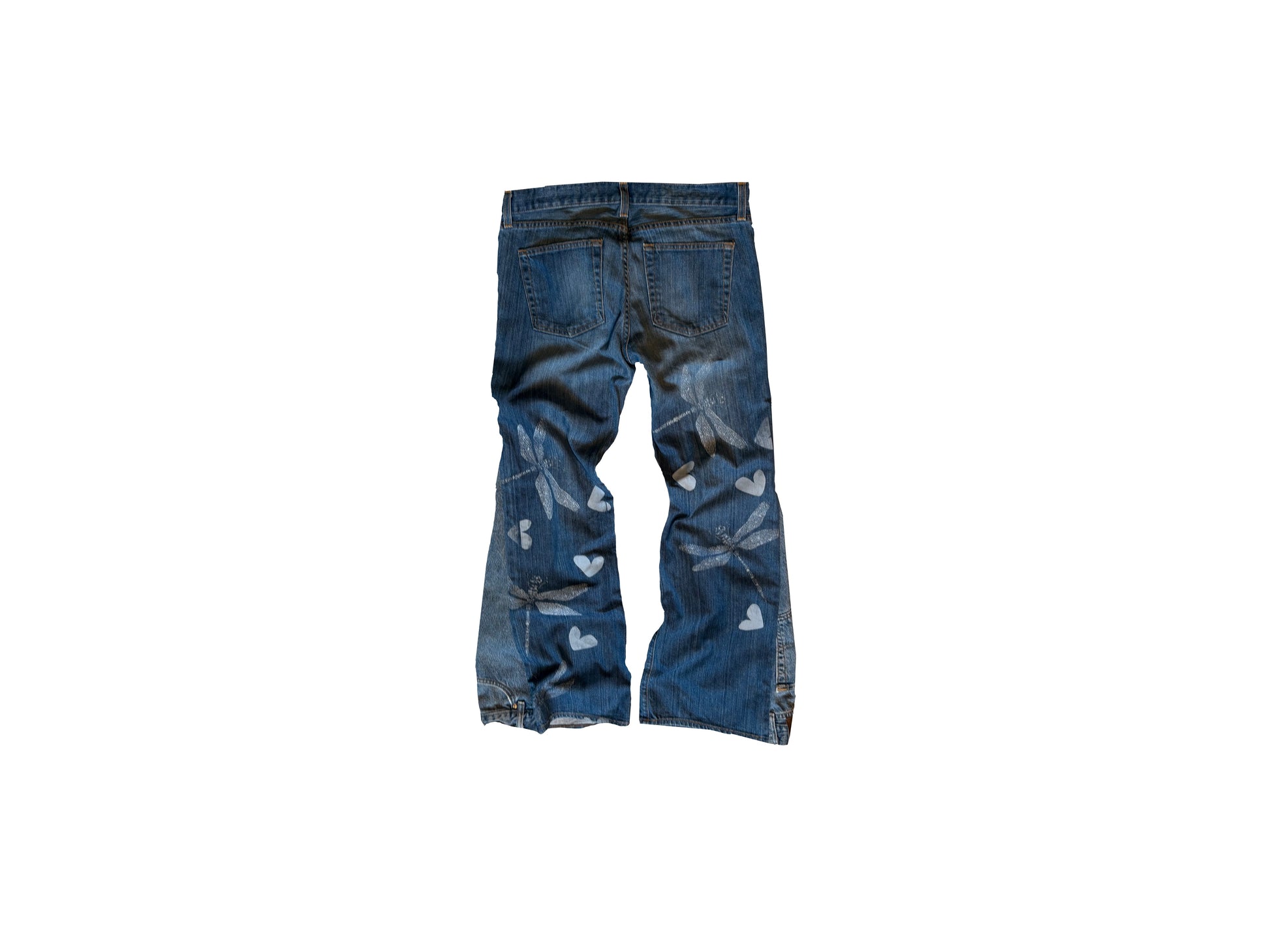 Introducing 'Loved Ones'—a flared denim statement piece that celebrates the people who matter most. These jeans feature a striking silhouette with a graceful flare that moves beautifully with every step. Upside-down pockets add an unexpected twist, while delicate dragonfly and heart embroidery honors those you cherish. This exclusive collaboration between Not in a Rush and Vacant Studio brings together thoughtful design and wearable art. Own a pair that tells your story and keeps your loved ones close.